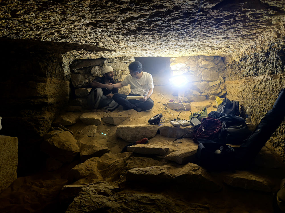 9月16日,在埃及開(kāi)羅以南的薩卡拉考古遺址區(qū),中埃薩卡拉聯(lián)合考古項(xiàng)目中方領(lǐng)隊(duì)薛江(右)和埃方同行在一座貴族墓內(nèi)工作。(受訪者供圖)