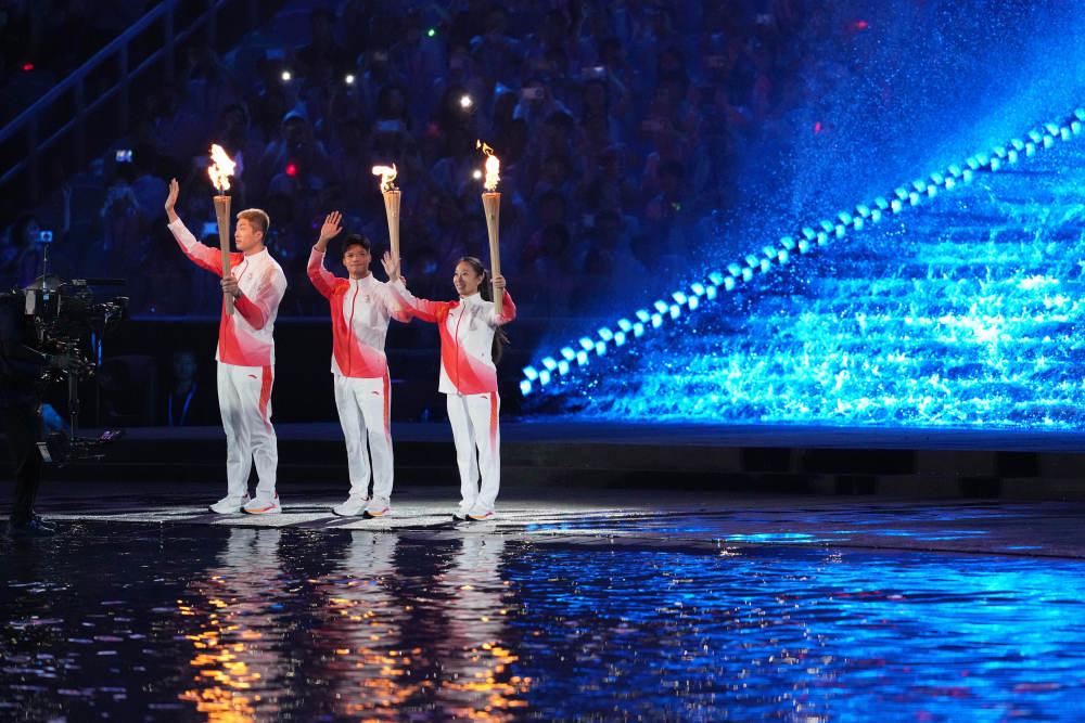 11月9日,火炬手蘇炳添(中)、張家朗(左)、李祎點燃主火炬后向觀眾致意。新華社記者肖藝九 攝