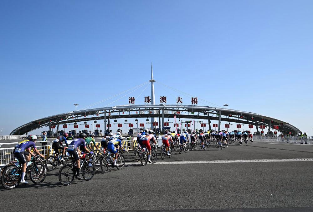 11月8日,在第十五屆全國運動會公路自行車男子個人賽決賽中,參賽選手在港珠澳大橋騎行。新華社記者梁旭 攝