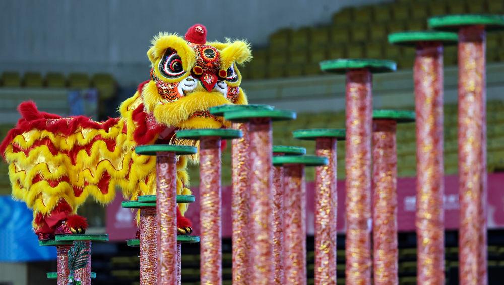11月11日,粵港澳聯(lián)隊在第十五屆全國運動會群眾展演舞龍舞獅南獅自選項目決賽比賽中。新華社記者 王鵬 攝