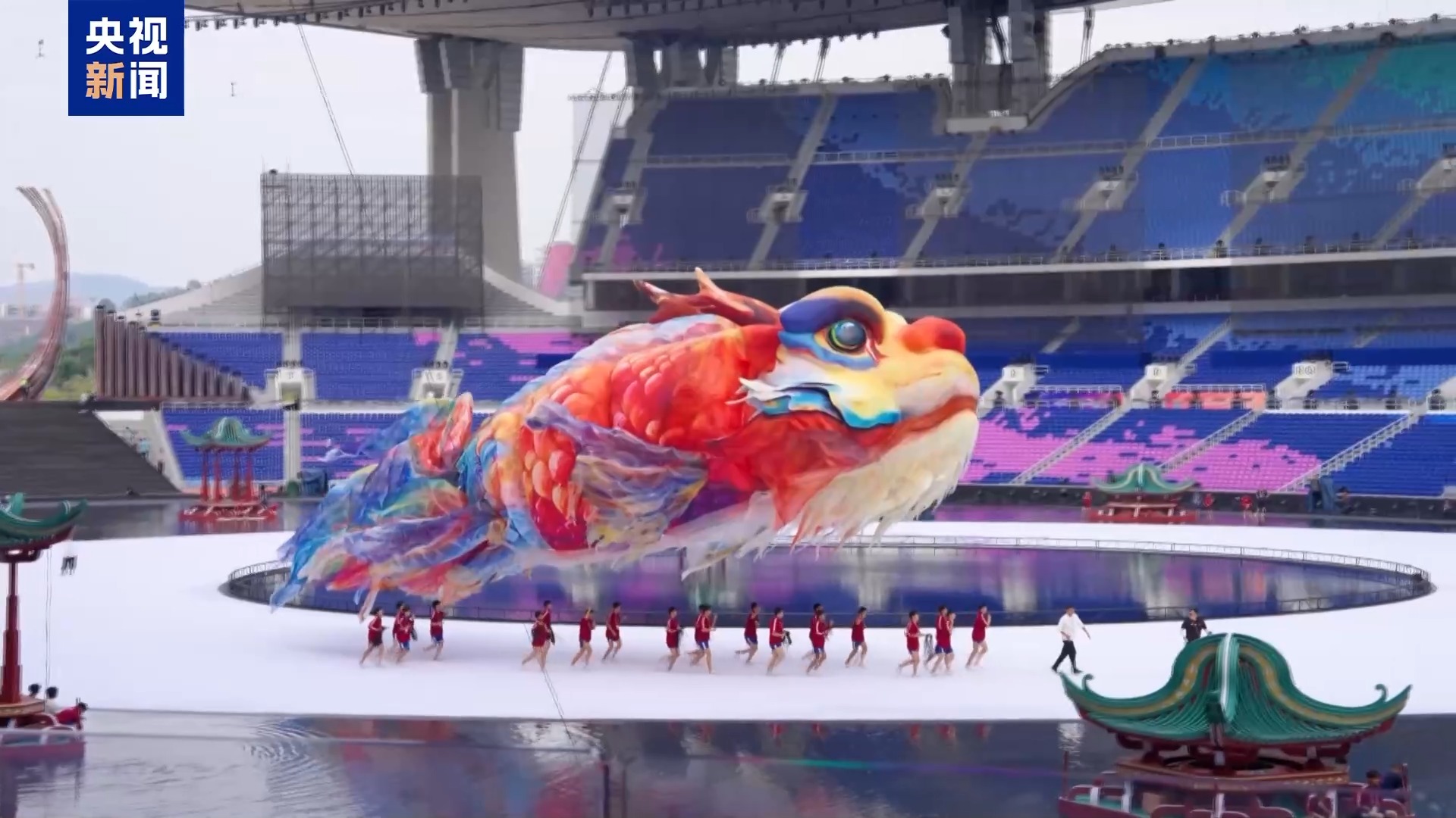 十五運(yùn)會(huì)開(kāi)幕式美術(shù)總設(shè)計(jì) 巨型鰲魚(yú)原創(chuàng)設(shè)計(jì)者 尚天寶:這只鰲魚(yú)的造型和傳統(tǒng)意義上的鰲魚(yú)有些許不同,保留了龍頭魚(yú)身,但是尾巴部分我們做了特殊的處理,把這種鳳尾鯉魚(yú)的大尾巴嫁接了進(jìn)來(lái),魚(yú)鰭、魚(yú)身參考了金龍魚(yú)的魚(yú)身,讓它更好看,色彩上更嶺南,發(fā)揮了嶺南的濃郁用色的極致。