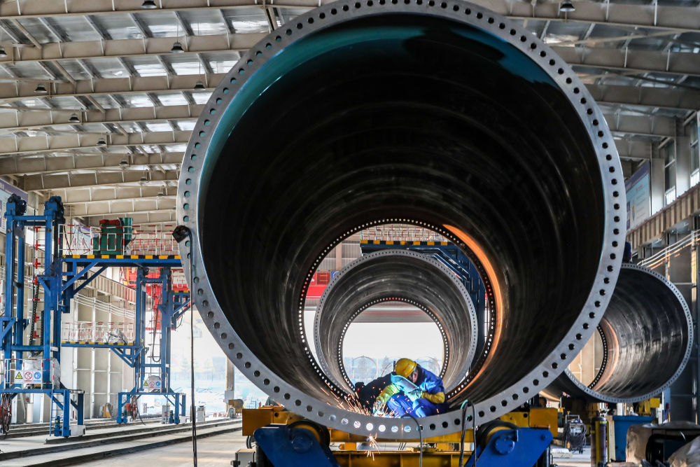 11月20日,在甘肅省酒泉經(jīng)濟(jì)技術(shù)開發(fā)區(qū)的中國(guó)水電四局(酒泉)新能源裝備有限公司塔筒制造車間,工作人員進(jìn)行風(fēng)機(jī)塔筒焊接作業(yè)。新華社記者 郎兵兵 攝