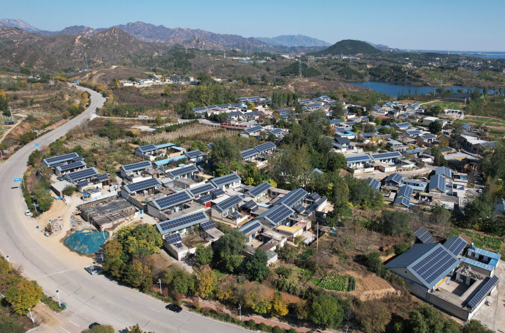 11月2日拍攝的河北省平山縣西柏坡鎮(zhèn)北莊村兆瓦級(jí)“光儲(chǔ)”智能微電網(wǎng)示范工程項(xiàng)目中的屋頂光伏發(fā)電板(無人機(jī)照片)。新華社記者 楊世堯 攝