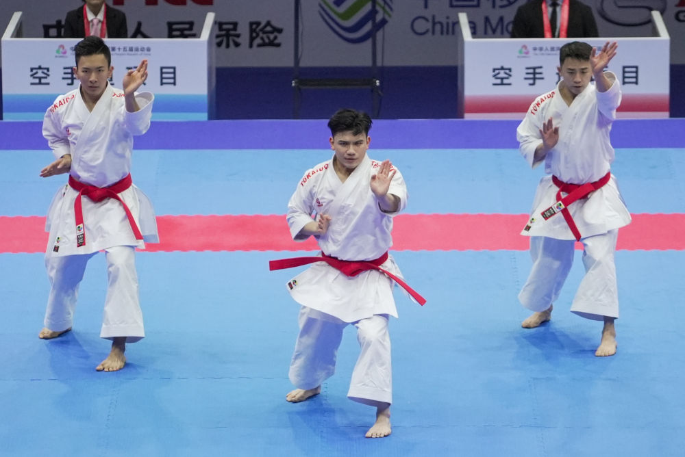 2025年11月6日,澳門代表隊在澳門舉行的第十五屆全國運(yùn)動會群眾比賽項目空手道男子業(yè)余組團(tuán)體型半決賽中。新華社發(fā)