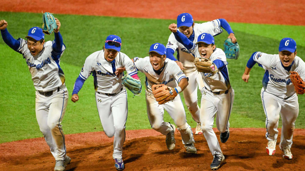 2025年11月19日,廣東隊球員在廣東中山舉行的第十五屆全國運(yùn)動會棒球1-4名交叉賽后慶祝勝利。新華社記者 丁磊 攝