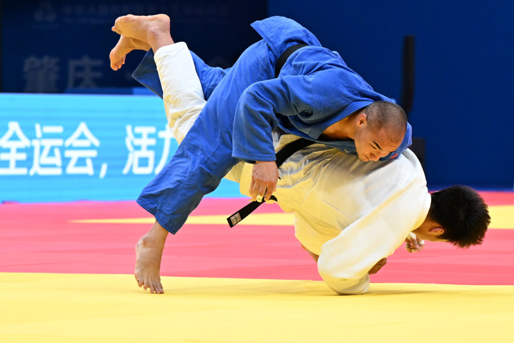 2025年11月12日,新疆隊選手阿卜杜熱西提·杰力力(上)和山東隊選手汪洋在廣東肇慶舉行的男子90公斤級銅牌賽中。新華社記者 朱祥 攝