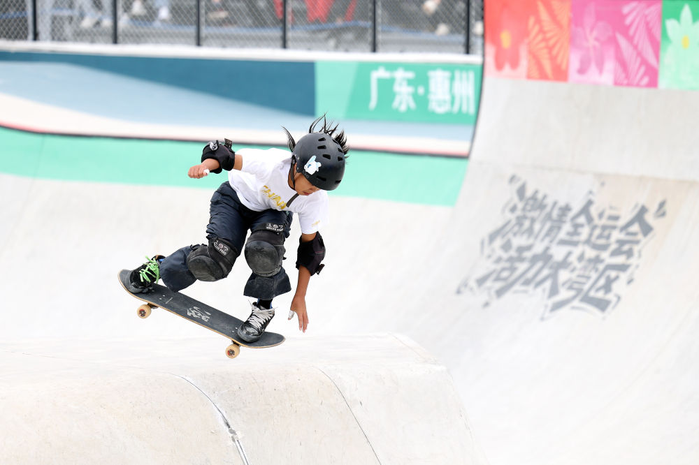 2025年11月11日,廣東隊選手鄒明珂在廣東惠州舉行的第十五屆全國運(yùn)動會滑板項目女子碗池賽決賽中。新華社記者盧漢欣攝