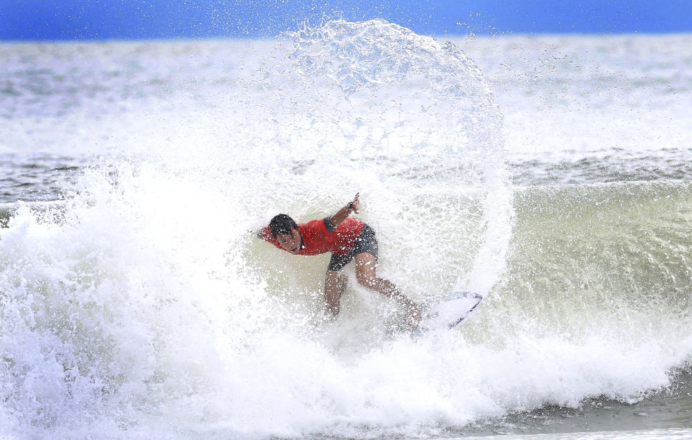 2025年11月13日,福建隊選手陳丙寅在廣東汕頭舉行的第十五屆全國運(yùn)動會沖浪男子短板第一輪比賽中。新華社記者盧漢欣攝