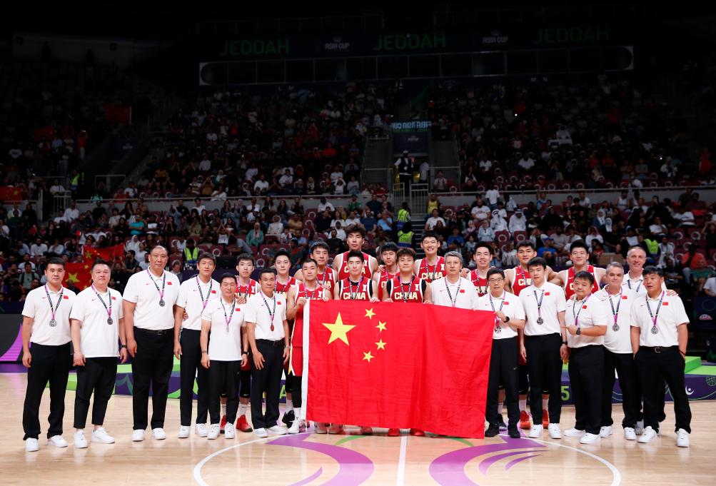 8月17日,在2025國際籃聯亞洲杯決賽中,中國隊獲得亞軍。圖為中國隊在頒獎儀式后合影。新華社記者 王東震 攝