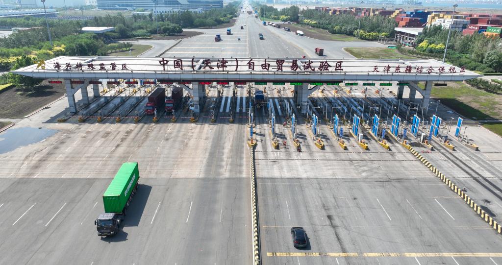 這是6月20日拍攝的天津自貿區(qū)天津港東疆片區(qū)入口處的中國(天津)自由貿易試驗區(qū)海關特殊監(jiān)管區(qū)入口(無人機照片)。新華社記者 孫凡越 攝