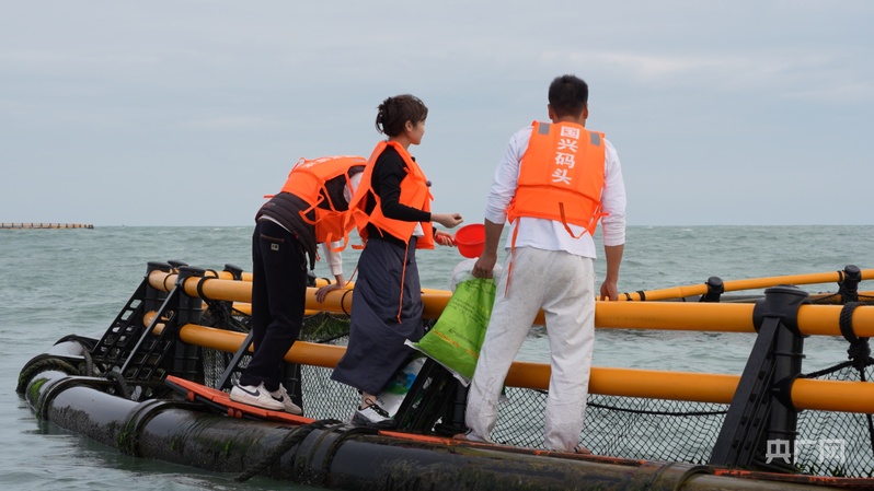 記者(中)在海洋牧場體驗(yàn)飼料投喂(央廣網(wǎng)記者 張順鵬 攝)
