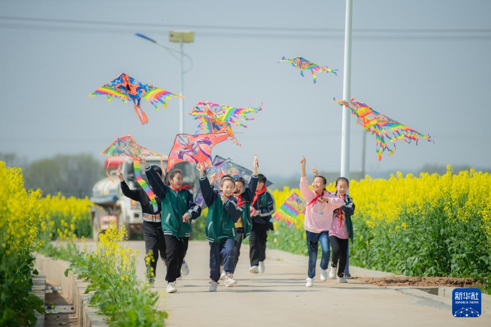 2023年3月10日,孩子們在瀏陽市永安鎮(zhèn)豐裕村放風(fēng)箏。新華社發(fā)