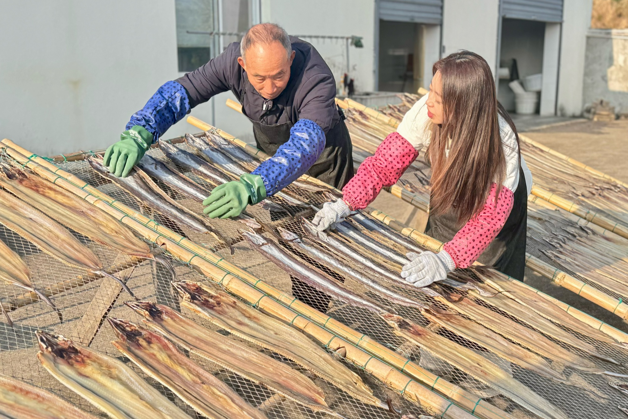 曬魚鲞是海島群眾的傳統(tǒng)習俗。近日,在當?shù)剡h近聞名的魚鲞專業(yè)村——茅洋鄉(xiāng)文洋村的文山一品魚鲞廠里,工人們正趁著晴好天氣忙著翻曬魚鲞,空氣中彌漫著咸鮮的海風氣息。選鮮、處理、腌制、晾曬的傳統(tǒng)工序與現(xiàn)代化流水線并行運轉,廠長鮑財富一邊指導工人包裝,一邊向記者介紹:“我從事這行已經(jīng)30余年了,多的時候日產(chǎn)量能有一二千斤,一般都是批量賣給飯店。”