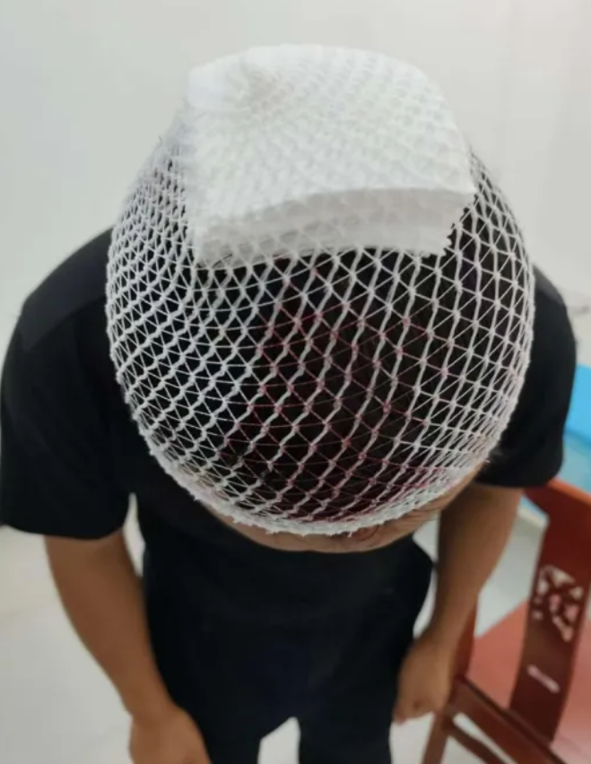 他的頭被包扎了起來