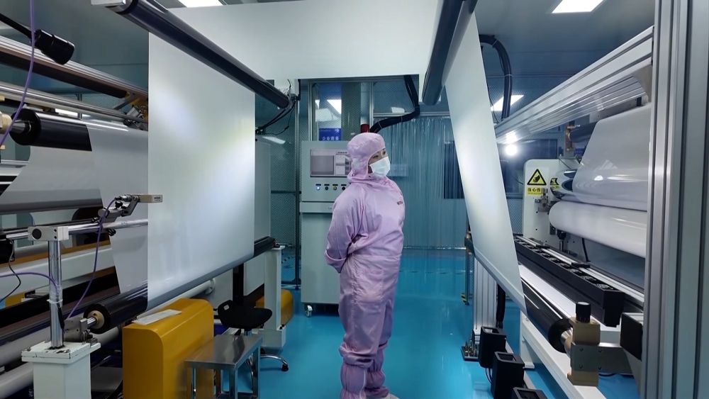 在園區(qū)內(nèi)的湖南壹鑫科技有限公司無塵生產(chǎn)車間,光學薄膜自動化生產(chǎn)線正滿負荷運轉(zhuǎn)。