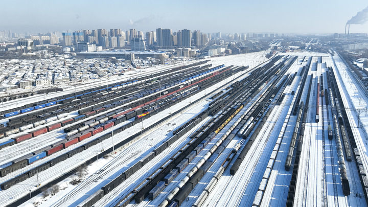裝滿物資的貨運(yùn)列車在黑龍江省哈爾濱南站編組站場整裝待發(fā)。“三九”天以來,針對北方降溫降雪天氣,中國鐵路哈爾濱局集團(tuán)有限公司哈爾濱南站積極開展電煤、生產(chǎn)物資保供專項(xiàng)行動,全力保障民生物資運(yùn)輸需求(2026年1月15日攝,無人機(jī)照片)。新華社發(fā)(原勇 攝)