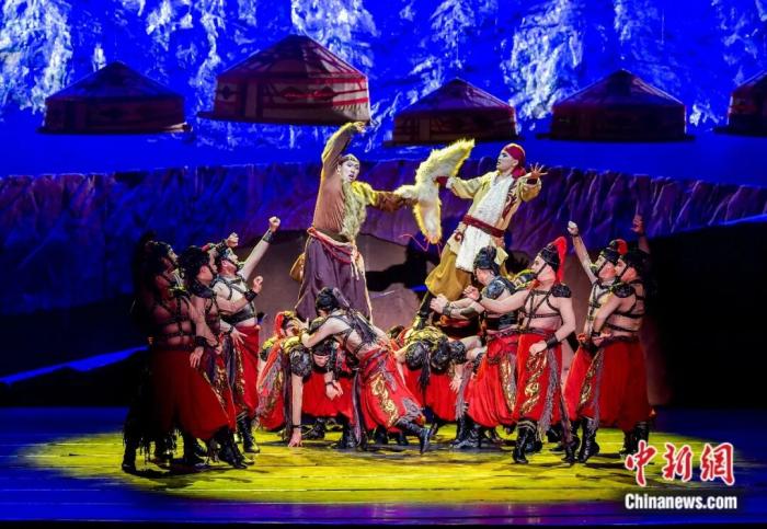 2023年4月7日,新疆烏魯木齊,原創(chuàng)歌舞劇《瑪納斯》作為首屆新疆文化藝術(shù)節(jié)優(yōu)秀劇目在新疆人民劇場(chǎng)上演。中新社記者 劉新 攝