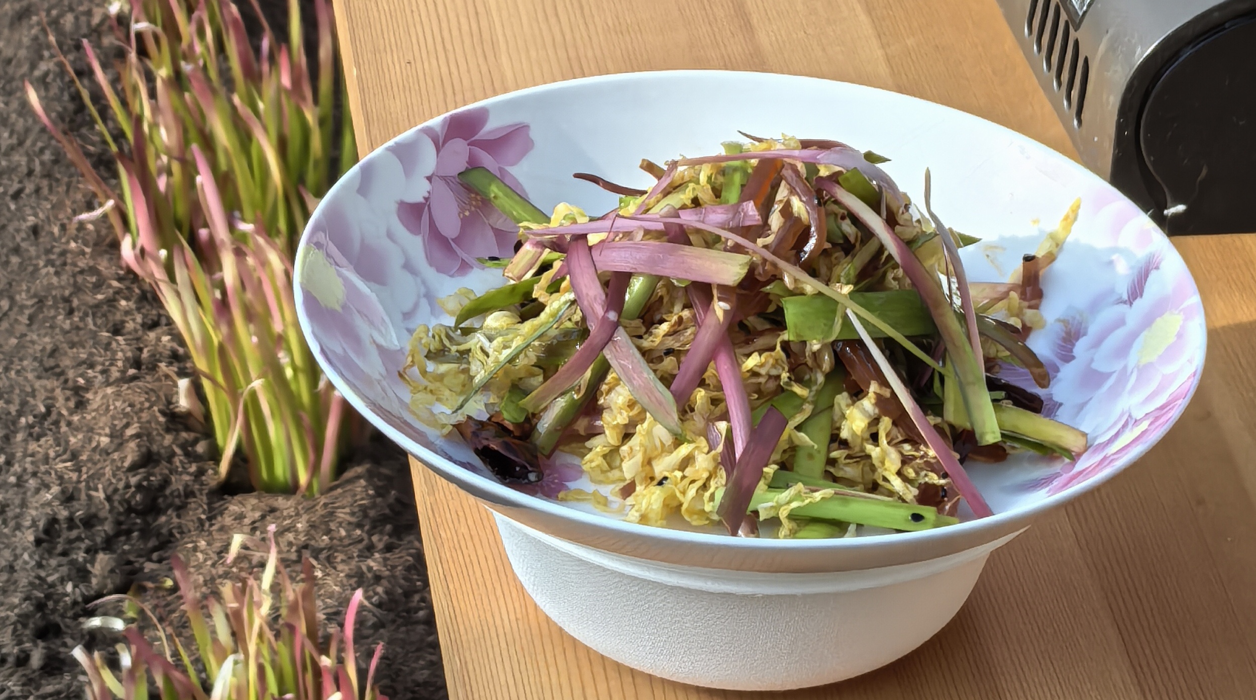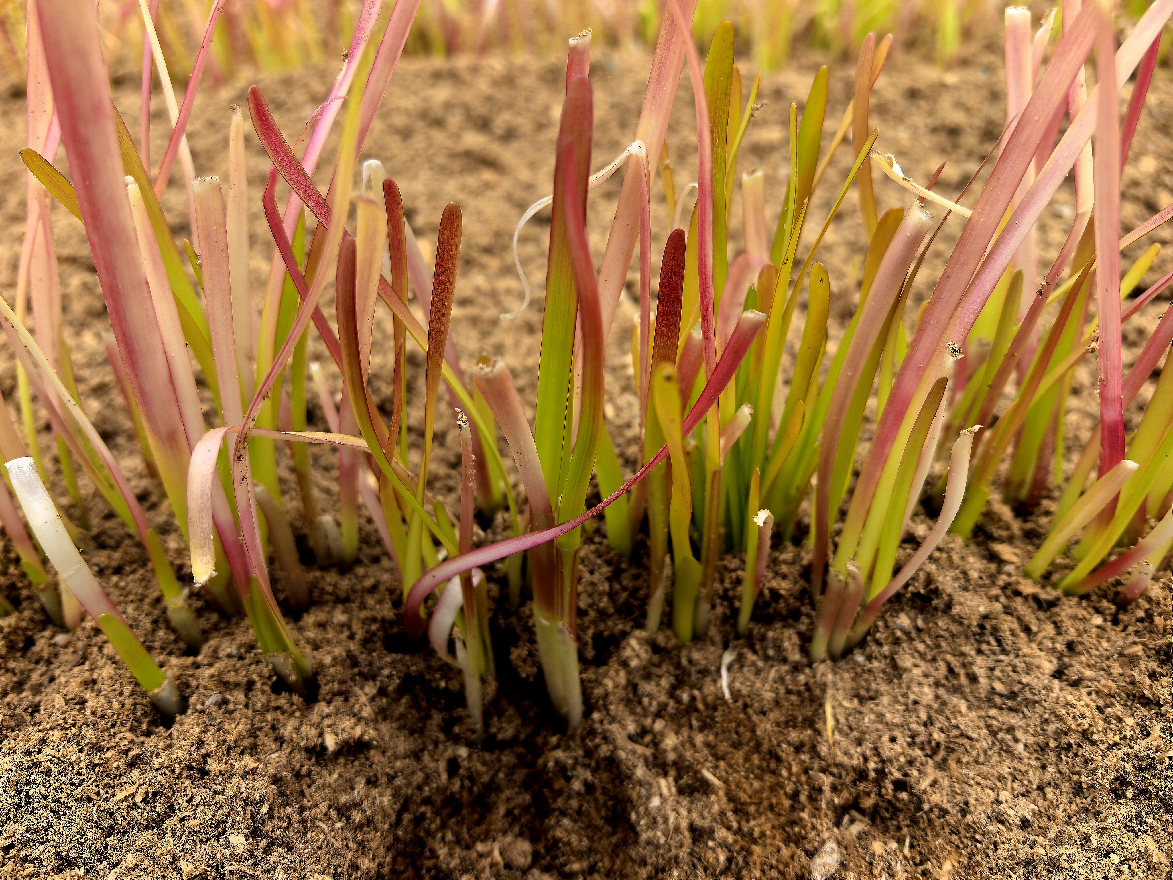 這樣的顏色并非品種天生,而是產(chǎn)于一套復(fù)雜細(xì)致的栽培技藝。在冬季,用特殊的基質(zhì)層層覆蓋韭菜地,精細(xì)調(diào)控掀蓋的時(shí)間、厚度來(lái)控制溫度和光照條件,使其在不同植株部位呈現(xiàn)出豐富的色彩。