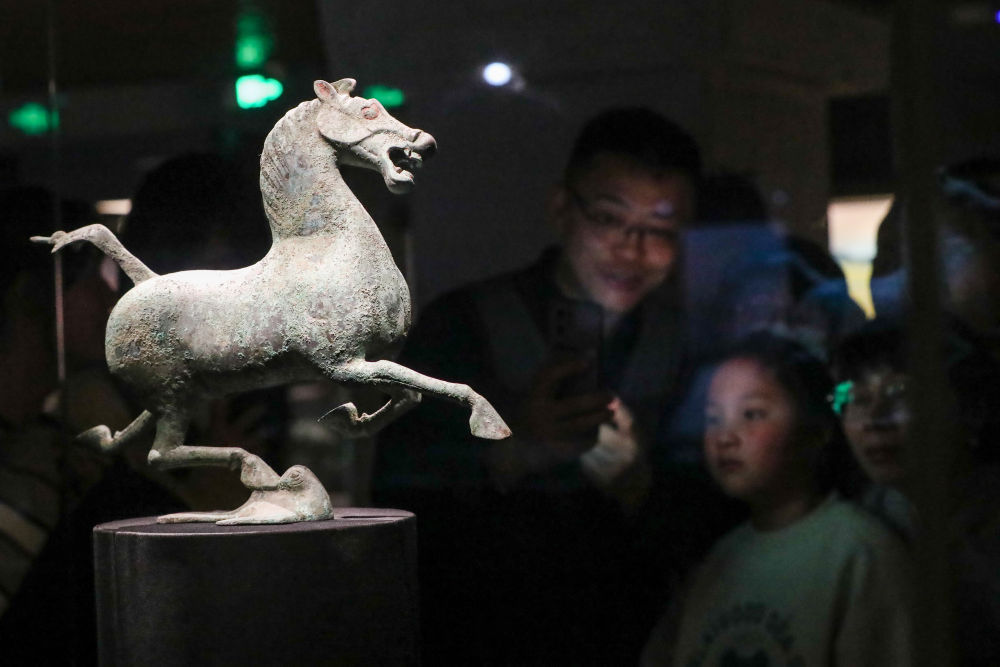 2026年1月26日晚,在甘肅省博物館二樓絲綢之路文明展廳,觀眾觀看銅奔馬(復(fù)制品)。新華社記者 郎兵兵 攝