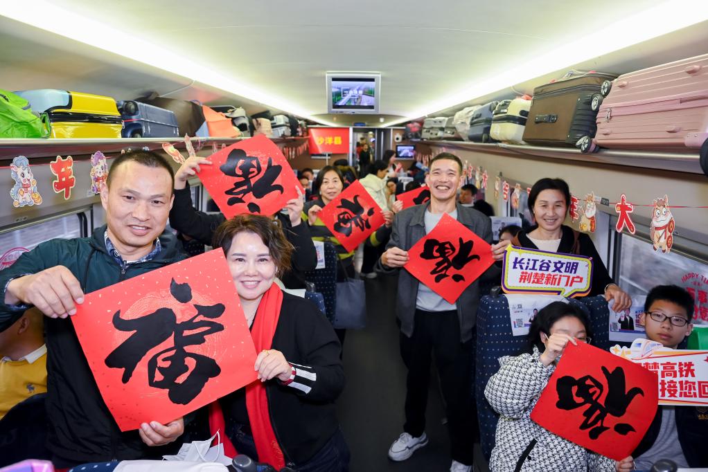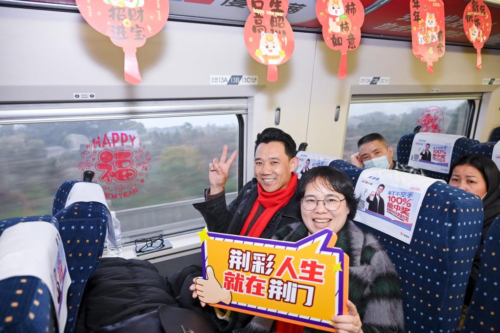 喜慶春聯、福字窗花、吉祥燈籠……2月7日,布置一新的G1136次列車,載著800多名在外務工的湖北荊門人從廣州啟程,一路歡聲笑語中,奔赴他們闊別已久的家鄉(xiāng)。