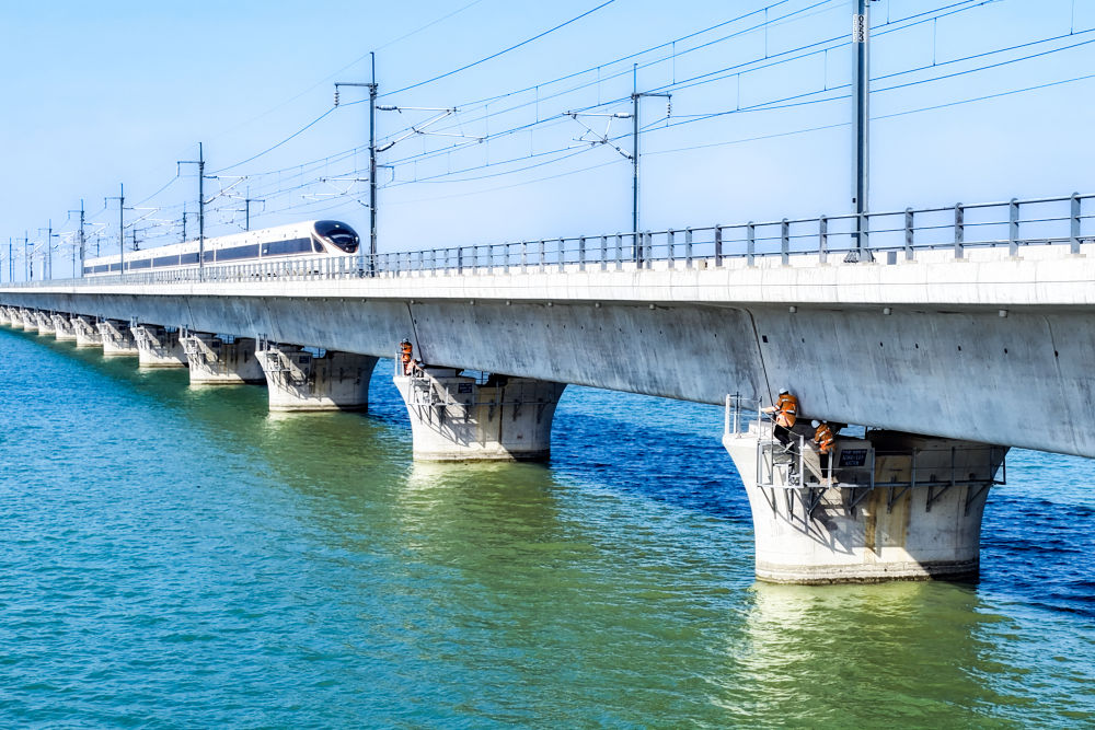春運(yùn)期間,上海高鐵基礎(chǔ)設(shè)施段湖州車間橋梁組工作人員在滬蘇湖高鐵元蕩湖段進(jìn)行檢修作業(yè)。