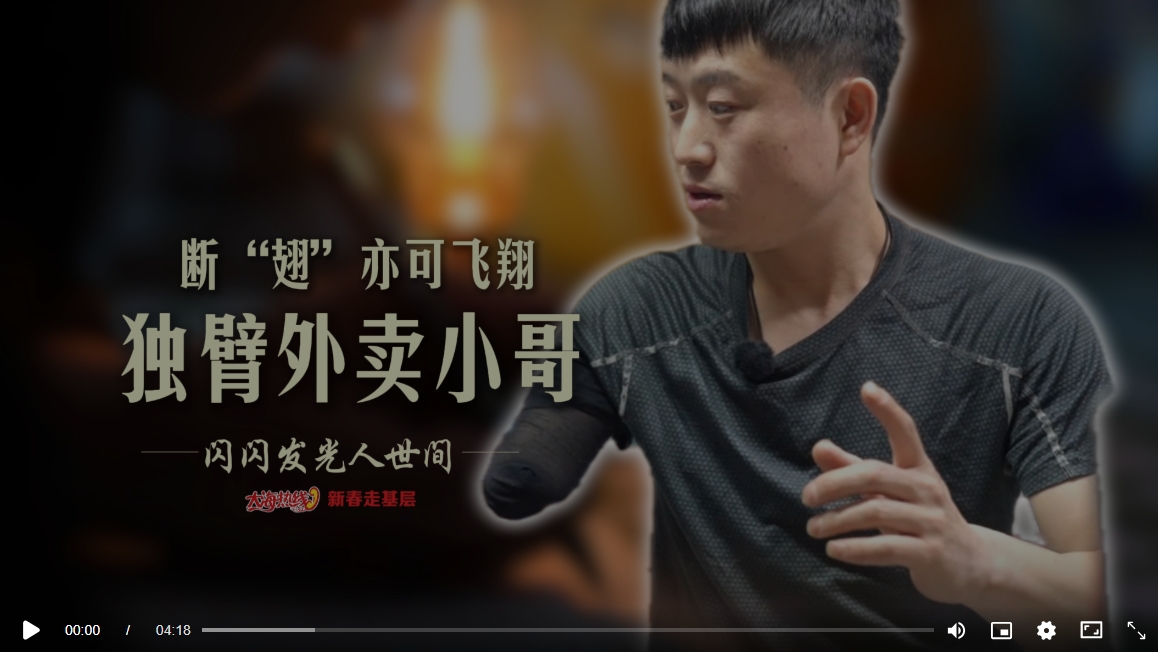 18歲意外失去右臂,不向命運(yùn)低頭,單手騎車、送餐、爬樓,憑著樂觀和韌勁,風(fēng)雨無阻跑遍阜新街巷。每天工作12小時(shí)、日均配送60單、爬樓100多層、騎行100多公里……