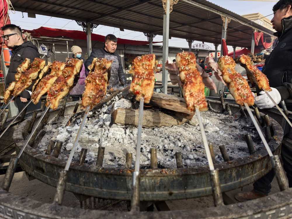 這是2月15日在喀什牛羊大巴扎上拍攝的售賣中的烤魚(yú)。新華社記者 蔡國(guó)棟 攝