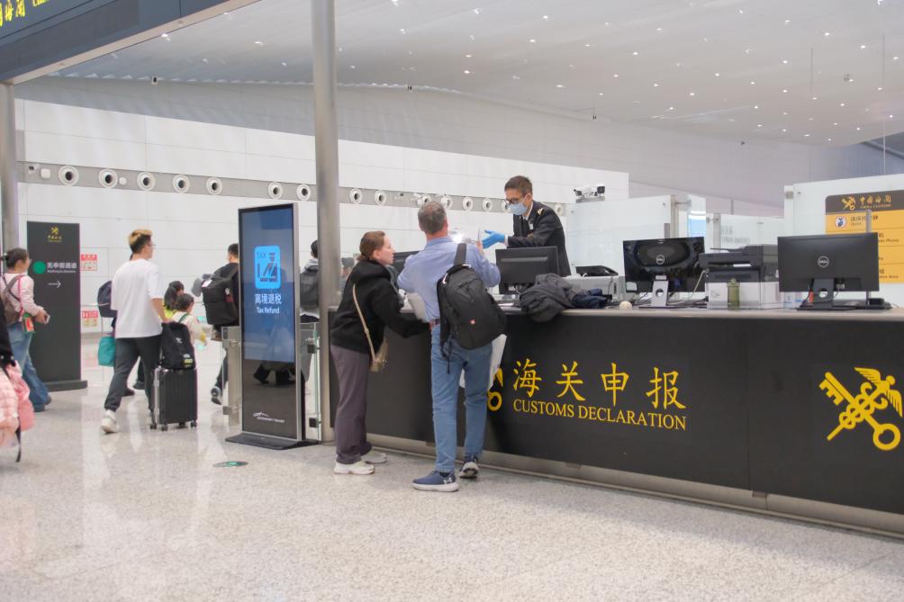 2月23日,廣州白云機(jī)場(chǎng)海關(guān)關(guān)員在出境申報(bào)臺(tái)為旅客辦理離境退稅驗(yàn)核業(yè)務(wù)。(受訪者供圖)
