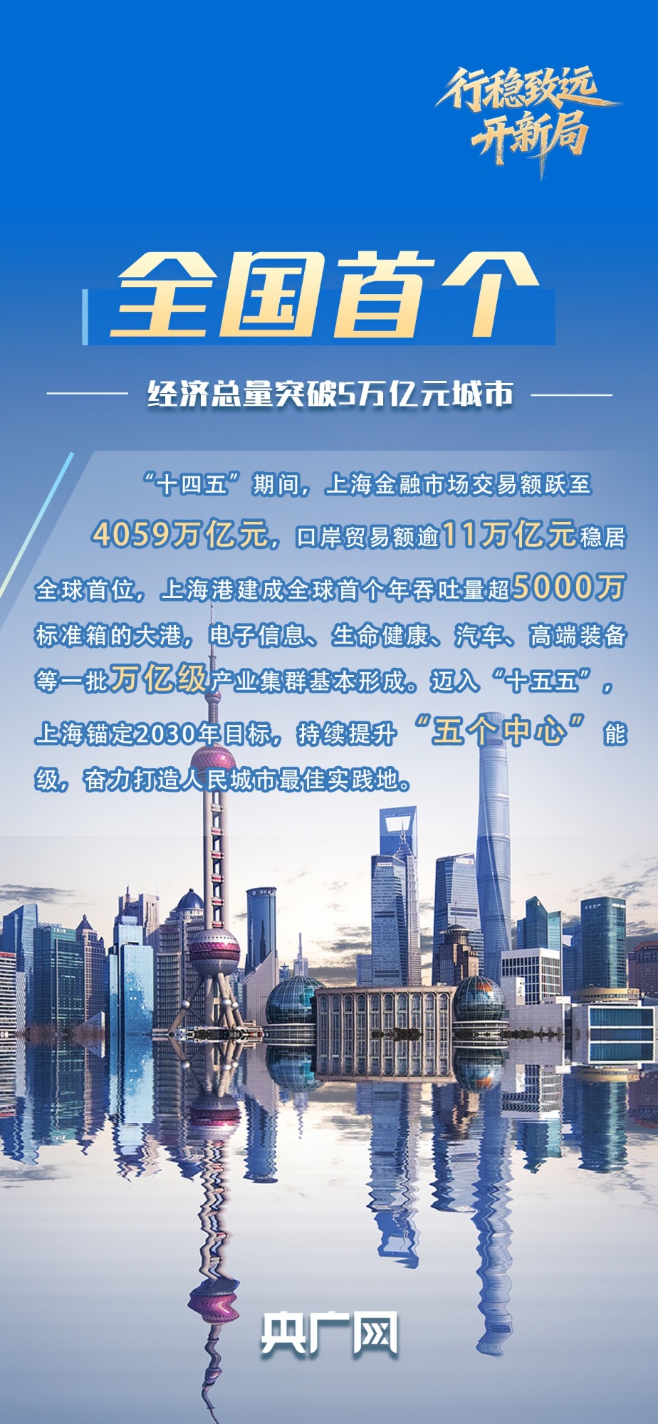 “十四五”期間,上海聚焦建設(shè)國際經(jīng)濟中心、金融中心、貿(mào)易中心、航運中心、科技創(chuàng)新中心的重要使命,綜合實力實現(xiàn)新跨越。全市生產(chǎn)總值從4.16萬億元增加到5.67萬億元,成為全國首個經(jīng)濟總量突破5萬億元的城市,躋身全球城市前五位。成績單背后,既是上?!拔鍌€中心”建設(shè)的階段性成效,更是“十五五”期間邁向更高能級的底氣所在。