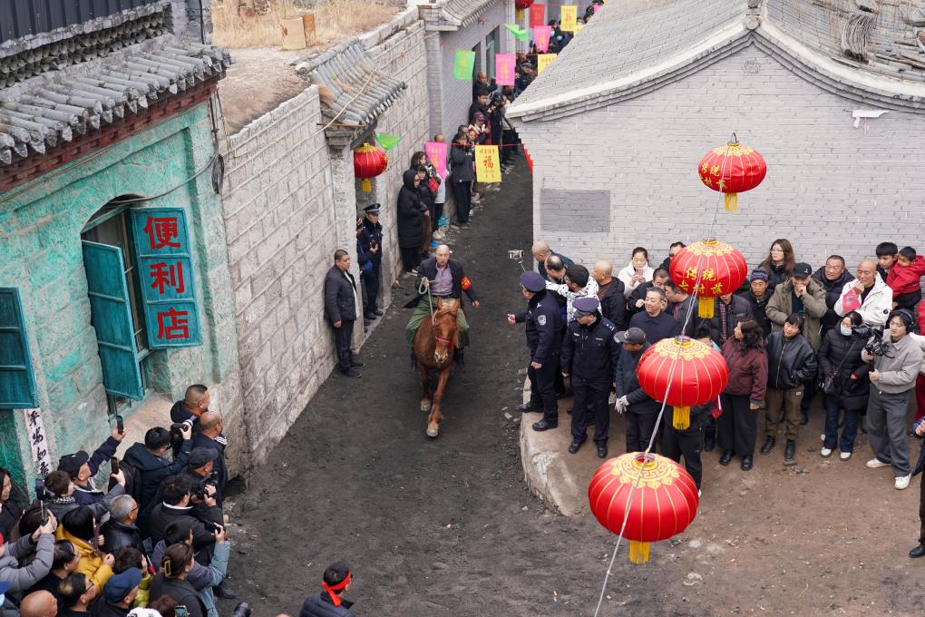 3月4日,農(nóng)歷正月十六,這個(gè)距離娘子關(guān)僅6公里的小山村,迎來(lái)了一年中最熱鬧的時(shí)刻,村中那條長(zhǎng)約400米、寬不足4米的青石古巷上,里三層外三層擠滿了人。沿路民房的臺(tái)階上、門檻上,甚至屋頂上,都早已站上了不請(qǐng)自來(lái)的看客,主人家卻也毫不在意:“今天這個(gè)大日子,大家一起熱鬧熱鬧!”