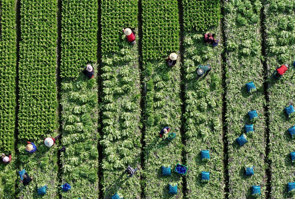 2026年2月24日,農(nóng)民在四川彭州市九尺鎮(zhèn)玉源社區(qū)的田地里采收油麥菜(無人機照片)。新華社發(fā)(羅國楊 攝)