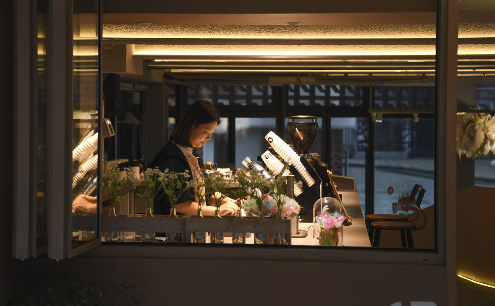 2024年4月22日,在重慶市九龍坡區(qū)謝家灣街道民主村社區(qū),飲品店工作人員在店內(nèi)忙碌。