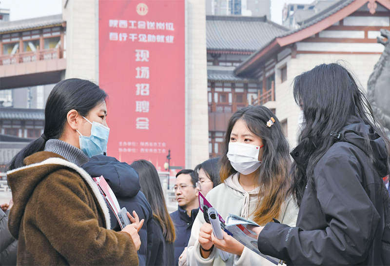 2024年3月6日,由陜西省總工會舉辦的2024年陜西工會“春送崗位”就業(yè)服務(wù)月啟動(dòng)儀式在西安舉行。與啟動(dòng)儀式同期舉辦的現(xiàn)場招聘會吸引約200家用人單位參加,提供崗位超過5000個(gè)。圖為當(dāng)日求職者在現(xiàn)場招聘會上與企業(yè)工作人員交流。 新華社記者 張博文/攝