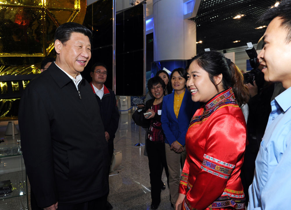 2013年5月4日,習(xí)近平來到中國航天科技集團(tuán)公司中國空間技術(shù)研究院,同各界優(yōu)秀青年代表座談并發(fā)表重要講話。這是座談會(huì)前,習(xí)近平和在展廳參觀的優(yōu)秀青年代表交談。