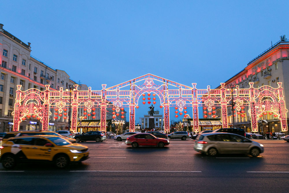 2024年2月9日,在俄羅斯首都莫斯科,車輛在中國新年主題裝飾前駛過。當日,“莫斯科的中國新年”文化活動在俄羅斯首都莫斯科市中心啟動。 新華社記者 白雪騏 攝