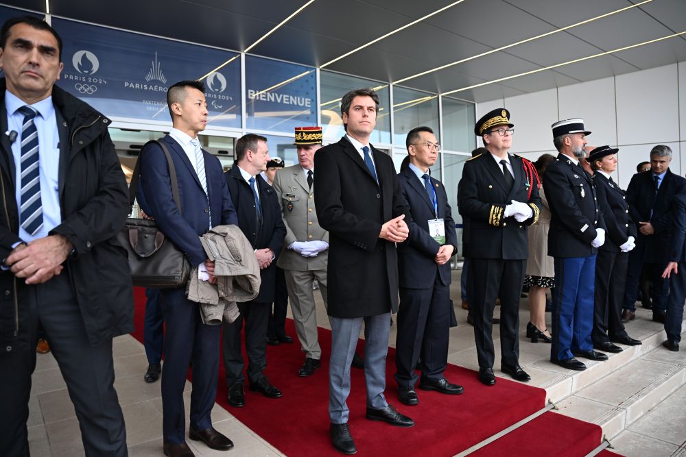 習近平乘坐專機抵達巴黎奧利機場時,法國總理阿塔爾等法國政府高級代表熱情迎接。