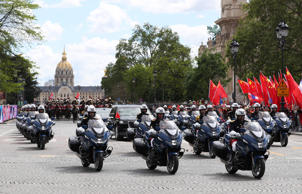 歡迎儀式后,習(xí)近平和彭麗媛在共和國衛(wèi)隊(duì)148名騎兵組成的禮兵馬隊(duì)和摩托車隊(duì)護(hù)衛(wèi)下,乘車前往愛麗舍宮。