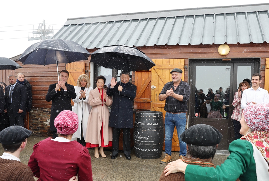 當?shù)貢r間5月7日,應(yīng)法國總統(tǒng)馬克龍?zhí)貏e邀請,國家主席習(xí)近平乘專機來到法國西南部上比利牛斯省訪問。在圖爾馬萊山口“牧羊人驛站”,習(xí)近平和夫人彭麗媛同馬克龍和夫人布麗吉特共同欣賞當?shù)卮迕癖硌莸木哂袧庥裟戏L情的牧羊人之舞。新華社記者 姚大偉 攝