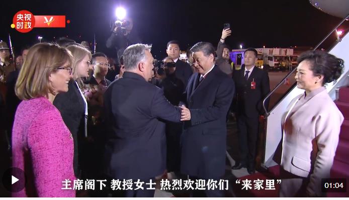 習近平乘坐的專機抵達布達佩斯國際機場時,匈牙利總理歐爾班夫婦、外長西雅爾多等政府高級官員熱情迎接。歐爾班總理對習近平主席夫婦說,歡迎你們“來家里”,我們感到極大榮光。