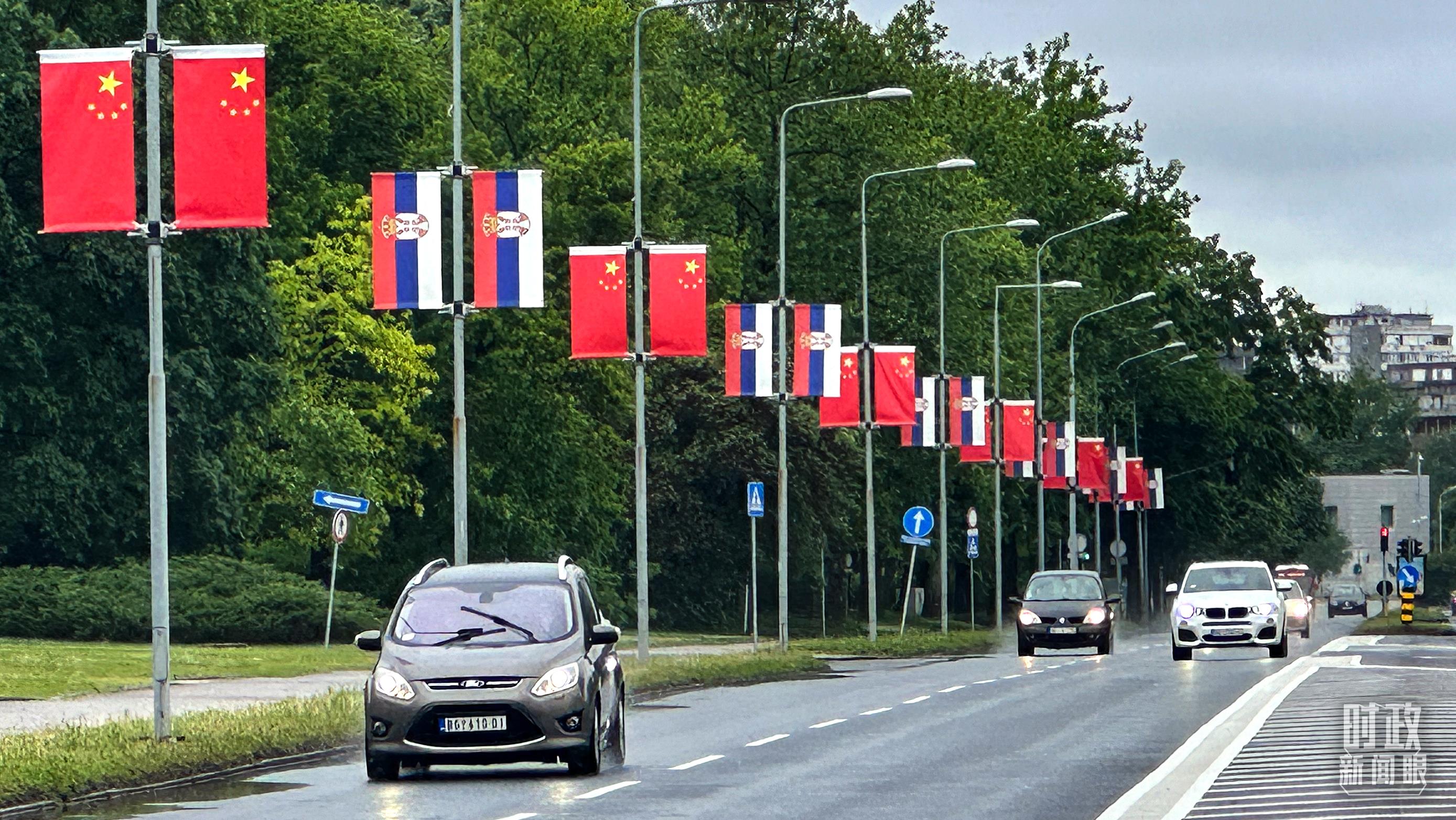 貝爾格萊德的主要街道掛滿五星紅旗,隨風(fēng)飄揚(yáng)。(總臺(tái)央視記者范一鳴拍攝)