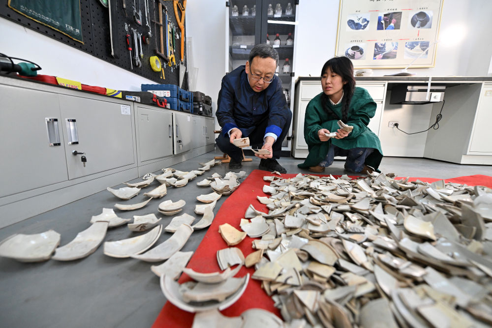 2024年2月25日,在山西云岡研究院可移動(dòng)文物修復(fù)室,云岡研究院院長(zhǎng)杭侃(左)和同事交流瓷器修復(fù)方案。