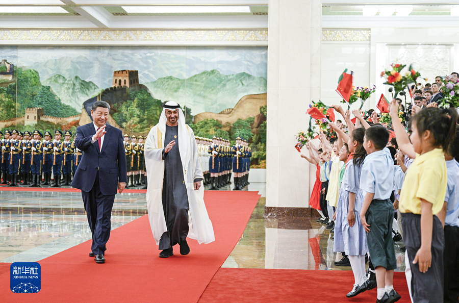 5月30日下午,國(guó)家主席習(xí)近平在北京人民大會(huì)堂同來華國(guó)事訪問并出席中國(guó)-阿拉伯國(guó)家合作論壇第十屆部長(zhǎng)級(jí)會(huì)議開幕式的阿聯(lián)酋總統(tǒng)穆罕默德舉行會(huì)談。這是會(huì)談前,習(xí)近平在人民大會(huì)堂北大廳為穆罕默德舉行歡迎儀式。新華社記者 申宏 攝