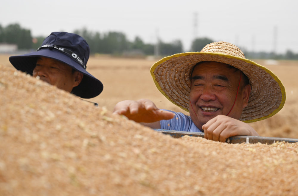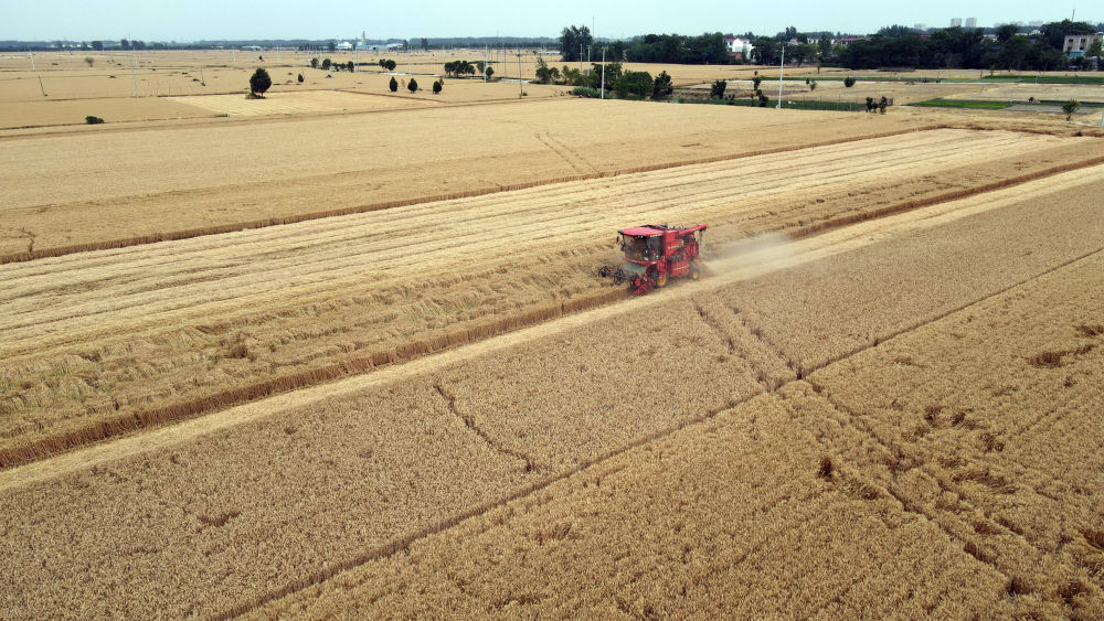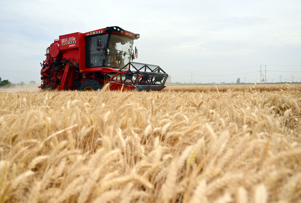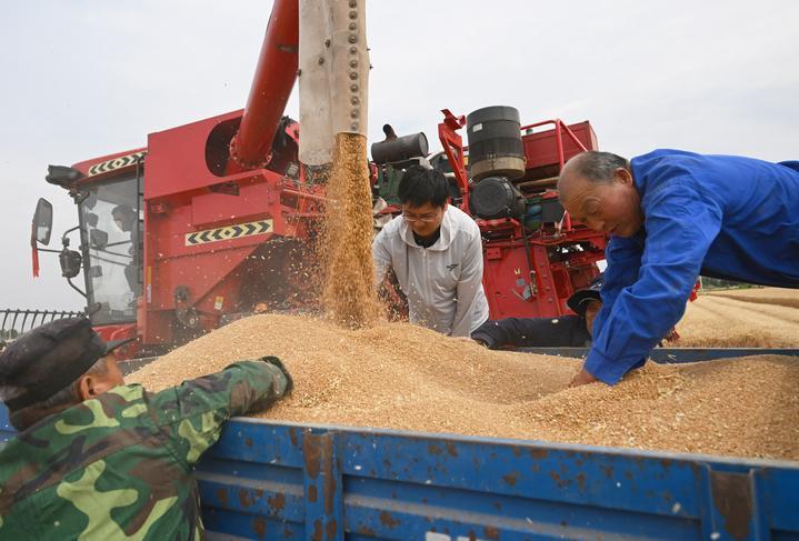 麥?zhǔn)諘r(shí)節(jié),在安徽阜陽(yáng)太和縣,機(jī)器轟鳴,麥浪翻滾如金色綢緞,飽滿的麥粒裝滿一輛輛運(yùn)糧車(chē)的貨廂。