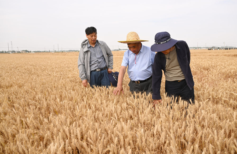 2024年5月29日,在太和縣淙祥現(xiàn)代農(nóng)業(yè)種植專業(yè)合作社,徐淙祥(中)和農(nóng)技專家一起為試驗(yàn)麥種測(cè)產(chǎn)。