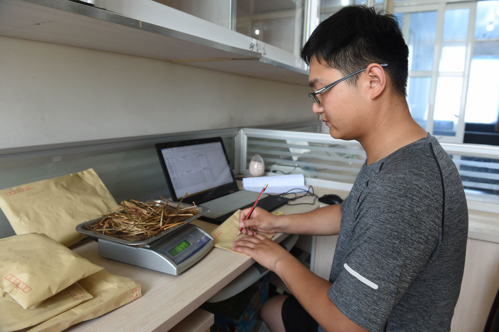 2022年6月28日,在太和縣淙祥現(xiàn)代農(nóng)業(yè)種植專業(yè)合作社,徐旭東在實(shí)驗(yàn)室對(duì)農(nóng)作物樣品進(jìn)行稱重和記錄。