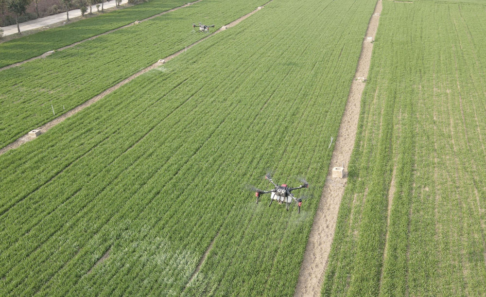 2023年2月21日,在太和縣淙祥現(xiàn)代農(nóng)業(yè)種植專業(yè)合作社,無(wú)人機(jī)噴灑農(nóng)藥(無(wú)人機(jī)照片)。
