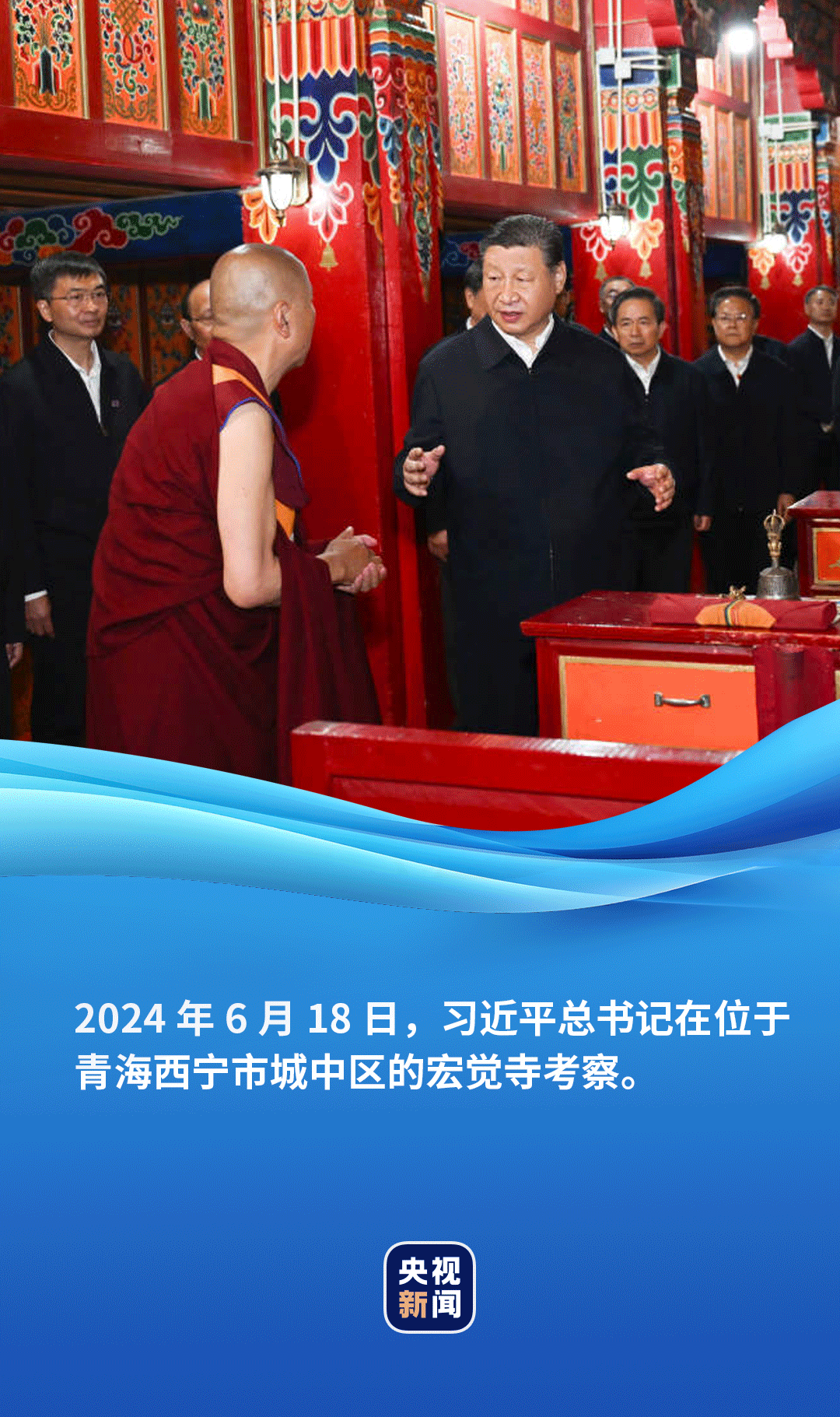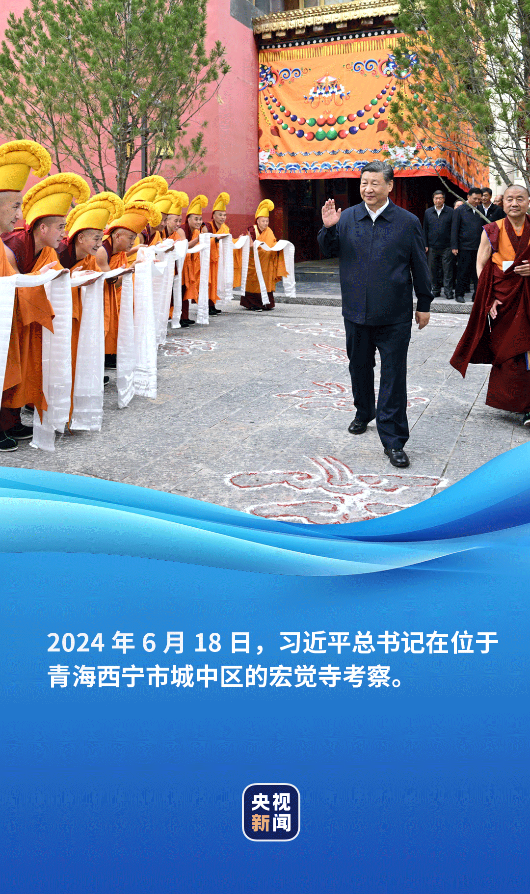 6月18日,正在青??疾斓牧?xí)近平總書記來到位于西寧市城中區(qū)的宏覺寺。在寺前院落,宏覺寺民主管理委員會負責(zé)人向總書記敬獻哈達,僧人提香爐、持寶傘迎接總書記。