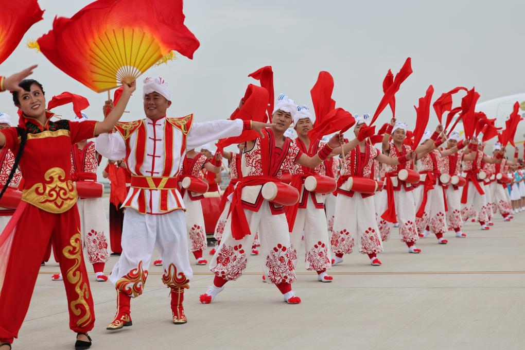 2023年5月17日下午,出席中國-中亞峰會的哈薩克斯坦總統(tǒng)托卡耶夫抵達陜西省西安市。當?shù)孛癖娨詿崆榈难?、歡快的秧歌等民間藝術表演歡迎貴賓到來。新華社記者 邢廣利 攝