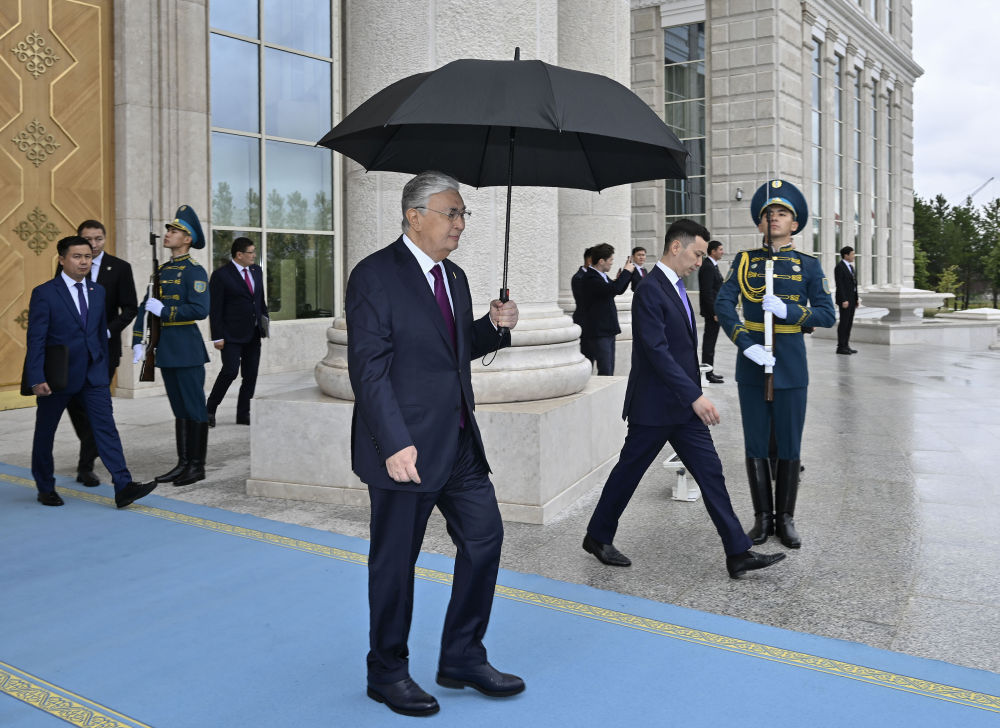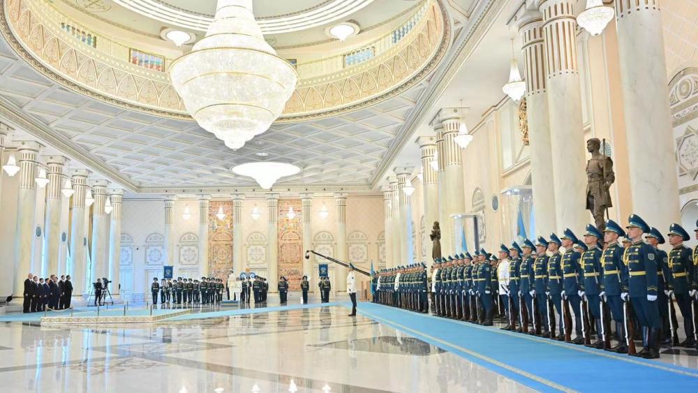 托卡耶夫為習(xí)近平舉行隆重歡迎儀式??偨y(tǒng)府大廳氣勢恢宏,禮兵威武挺拔。兩國元首分別同對方陪同人員一一握手致意。兩國元首登上檢閱臺,軍樂團(tuán)奏中哈兩國國歌。習(xí)近平在托卡耶夫陪同下檢閱儀仗隊。