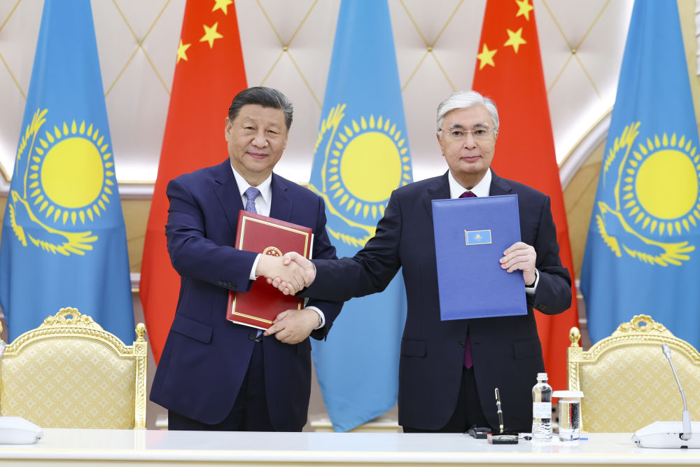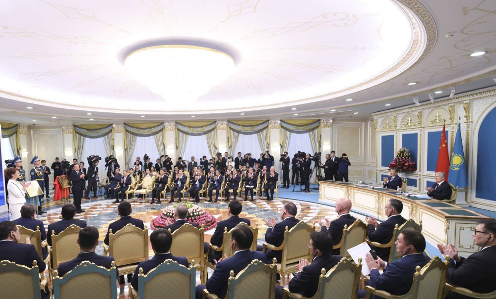 兩國元首共同簽署《中華人民共和國和哈薩克斯坦共和國聯(lián)合聲明》,并共同見證交換經(jīng)貿(mào)、互聯(lián)互通、航空航天、教育、媒體等領(lǐng)域數(shù)十項雙邊合作文件。
